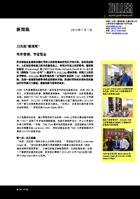 GMN 公司是德国纽伦堡市的一家经营多年的知名家族企业,约有 450 名 员工,主要经营机床轴、高精度滚珠轴承、飞轮和密封件,业务范围遍及 全球。在西门子 TAC 中心的一次活动上,该公司首次与 ZOLLER 公司接 触。活动中,ZOLLER 公司展示的三维扫描仪引起了强烈反响。ZOLLER 公司一直以实现更高的成本效益为理念。“实际上,这是我们首次意识到 机会的到来,”项目经理 Harald Distler 表示。 为了改善成本状况,减少零部件的产出时间,GMN 公司的计算机数字控制 部(CNC)采取了许多结构调整措施:包括外部程序设计、中心刀具盒和 外部刀具预调。一年前,TMS Plus 最终完成现场安装,该系统配备刀具预 调仪和测量设备»venturion 450«,同时还配备采用 TMS 刀具管理解决方 案的 SILVER 成套设备。